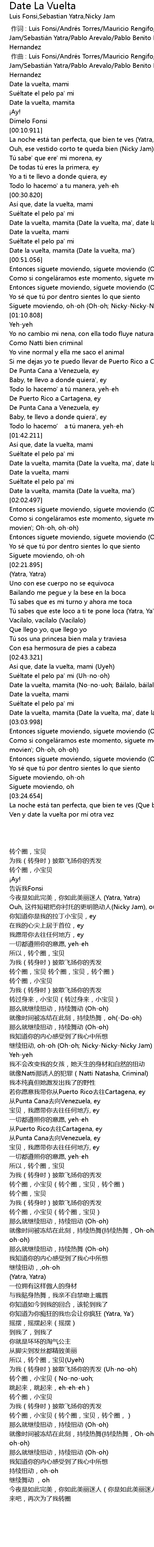 | [03:00.119] | Date la vuelta, mamita Date la vuelta, ma', date la vuelta |
