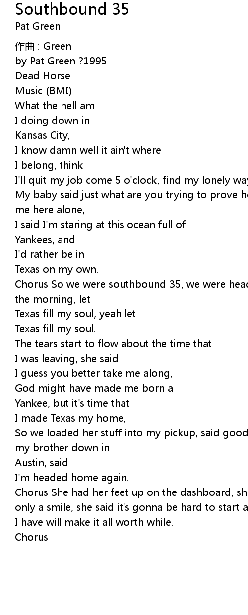 | Chorus So we were southbound 35, we were headed down the road, hit the border by the morning, let | |