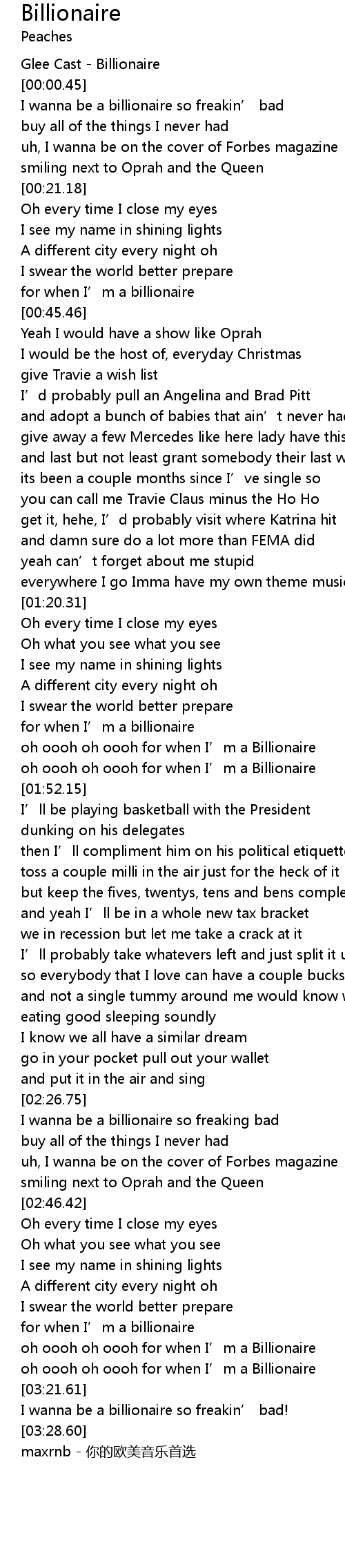 | [01:48.60] | oh oooh oh oooh for when I' m a Billionaire |