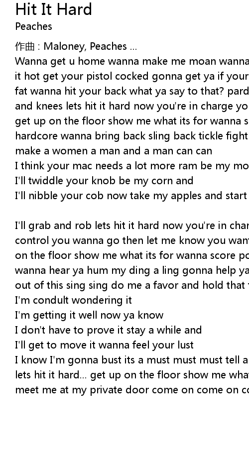 | Wanna get u home wanna make me moan wanna get u in my pleasure dome wanna make it hot get your pistol cocked gonna get ya if your ready or not wanna chew the fat wanna hit your back what ya say to that? pardon me but please on you hands and knees lets hit it hard now you're in charge you wanna roll then take control get up on the floor show me what its for wanna score por favor come on rock it hardcore wanna bring back sling back tickle fight wanna do it do it do it right make a women a man and a man can can | |