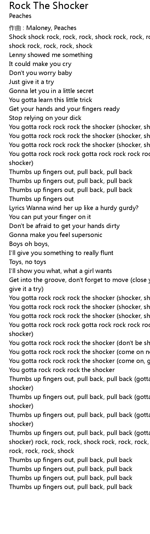 | Thumbs up fingers out, pull back, pull back (gotta rock rock rock rock rock the shocker) rock, rock, rock, shock rock, rock, rock, shock rock, rock, rock, shock rock, rock, rock, shock | |