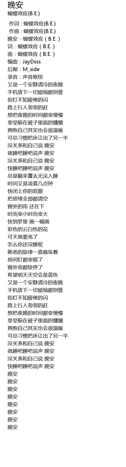 | [00:00.00] | 晚安 - 蝴蝶效应(B.E.) |