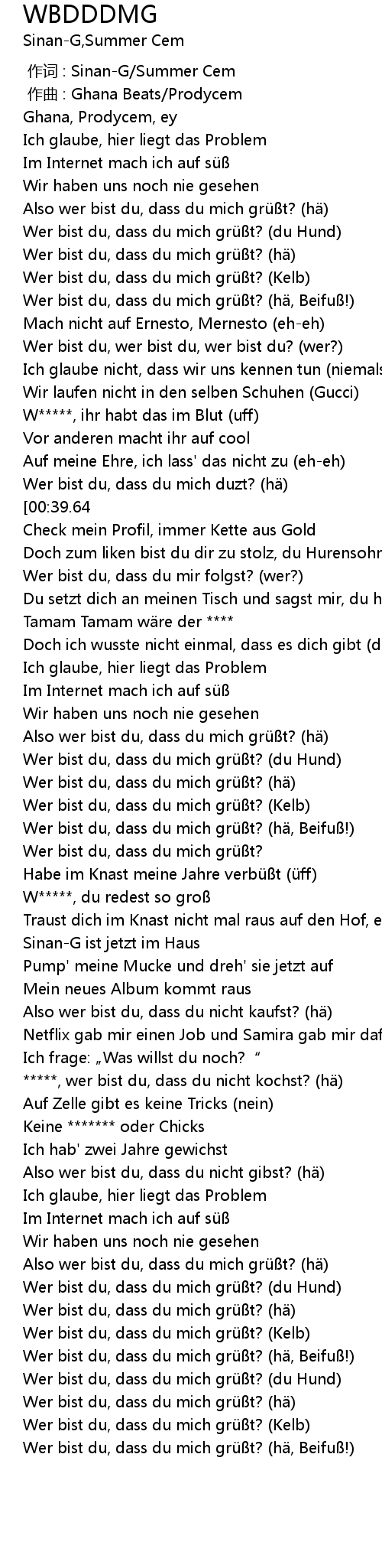 | [01:09.43] | Wer bist du, dass du mich grüßt? (hä) |