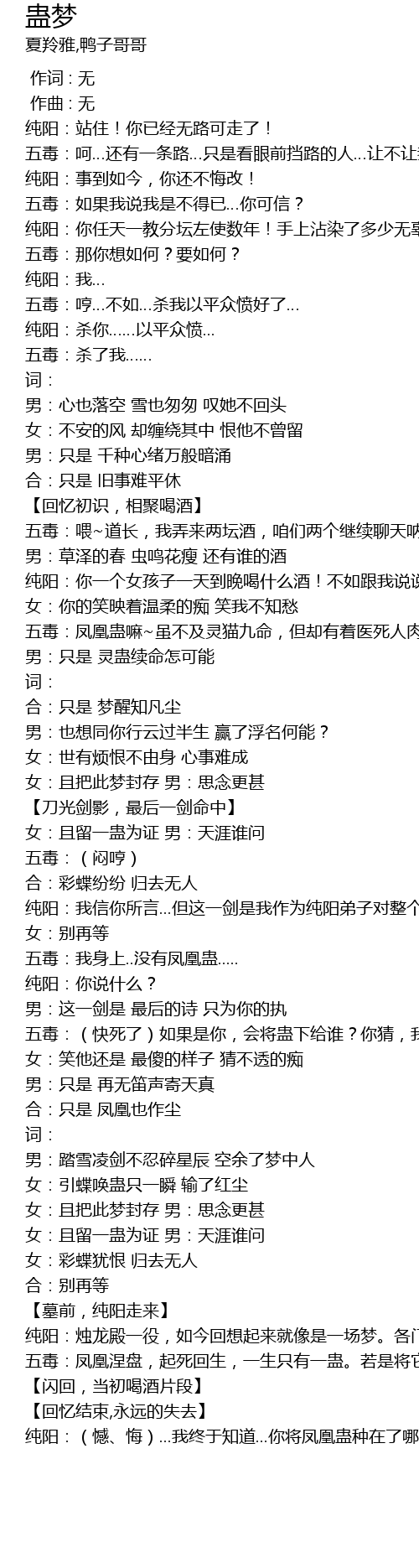 | [02:16.185] | 女:且留一蛊为证 男:天涯谁问 |