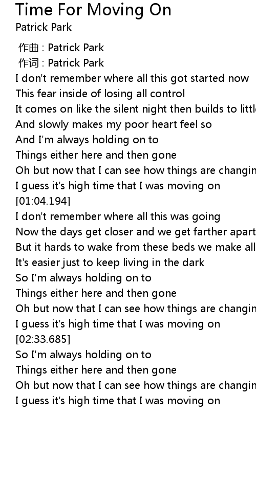 | [02:29.368] | I guess it' s high time that I was moving on |