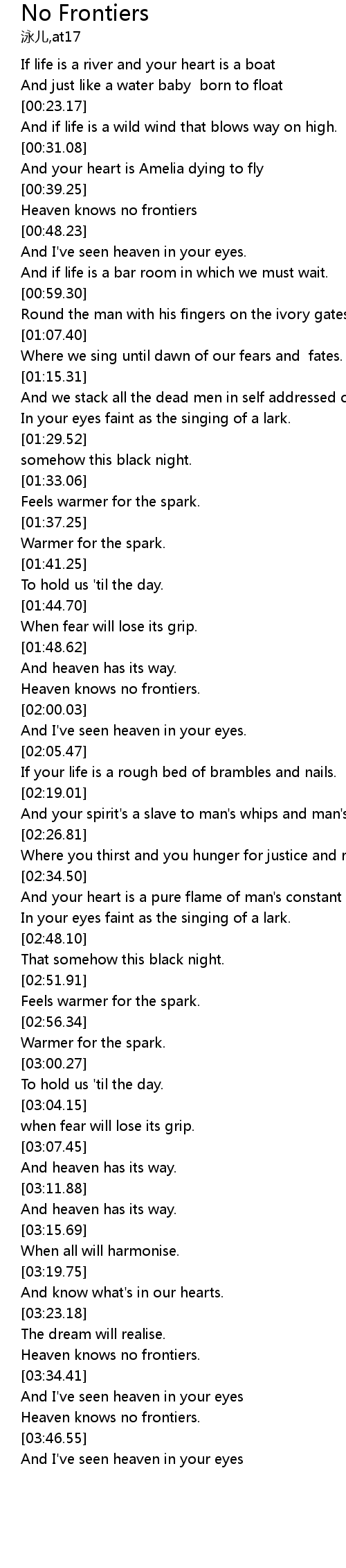 | [00:41.13] | Heaven knows no frontiers |
