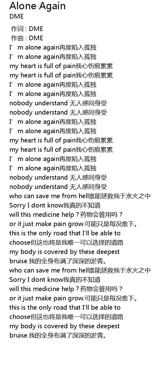 | [01:07.843] | I' m alone again zài dù xiàn rù gū dú |