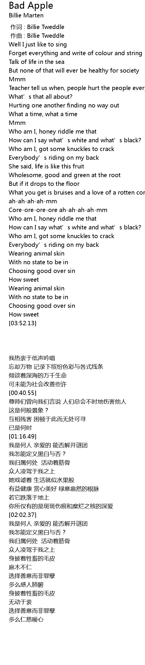| [00:00.000] | zuo ci : Billie Tweddle |