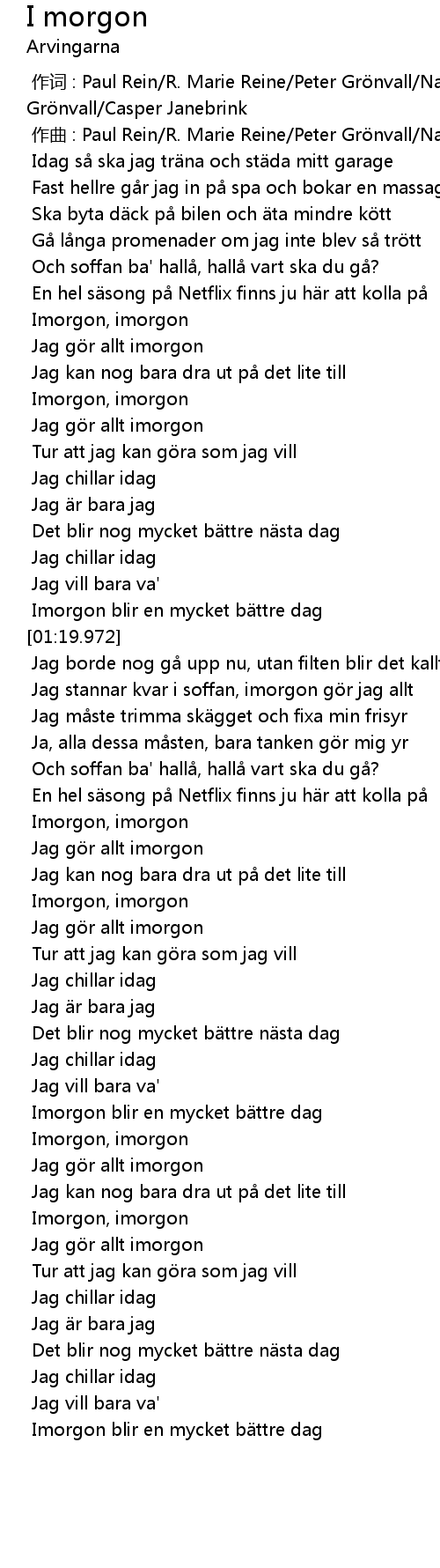 | [01:30.284] | Jag stannar kvar i soffan, imorgon gör jag allt |