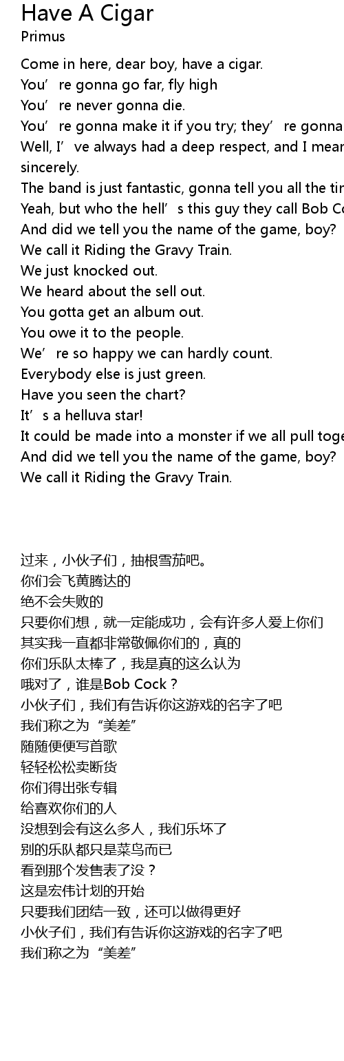| [00:55.78] | Come in here, dear boy, have a cigar. |