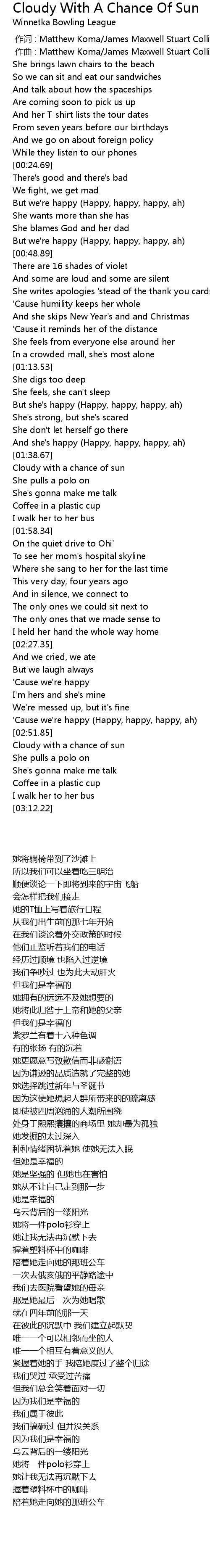 | [00:54.95] | She writes apologies 'stead of the thank you cards |