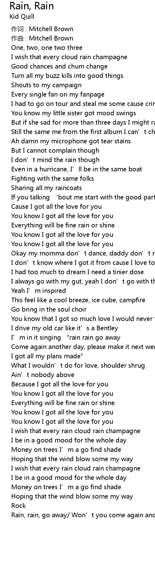 | [02:29.065] | Rain, rain, go away Won' t you come again another day x4 |