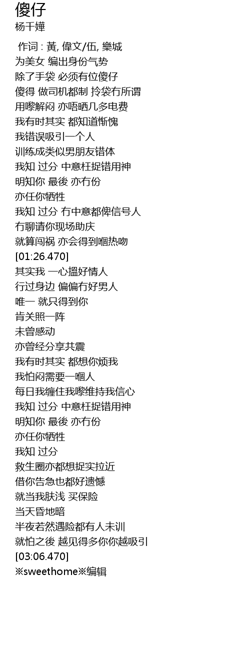 | [01:56.320] | 我怕闷需要一嗰人 |