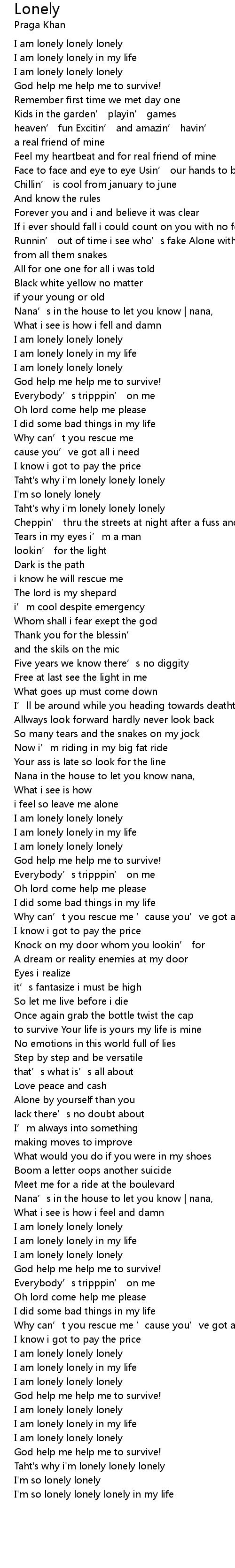 | [05:16.950] | I am lonely lonely in my life |