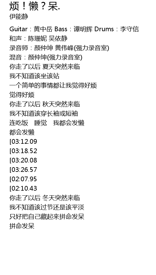 | [03:28.08][03:12.09][01:52.14][01:35.77] | 烦烦烦 懒懒懒 呆呆呆 |