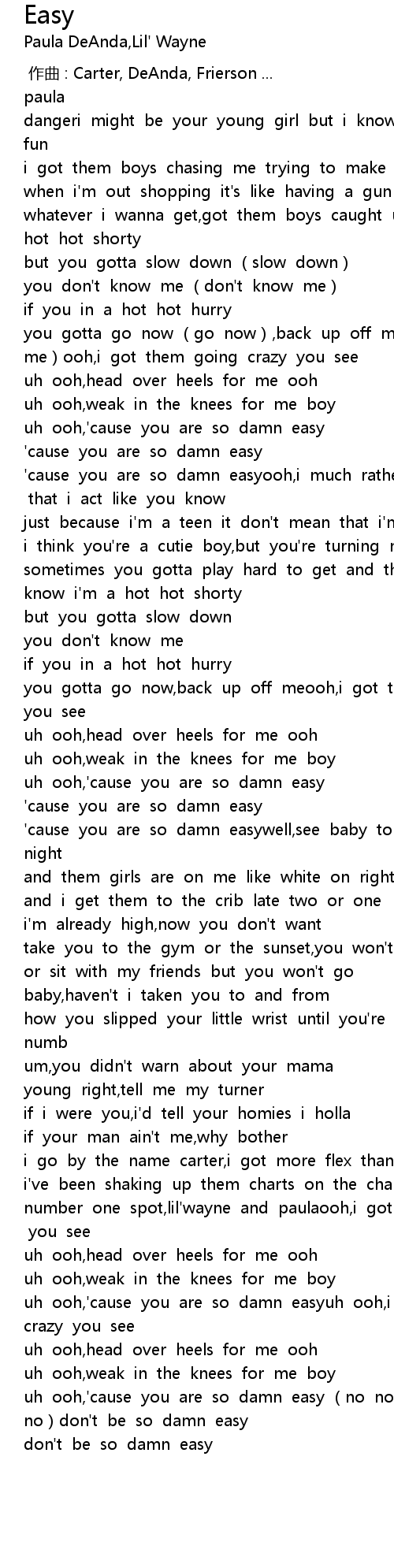 | [03:06.727] | uh ooh,' cause you are so damn easy no no no no no don' t be so damn easy |