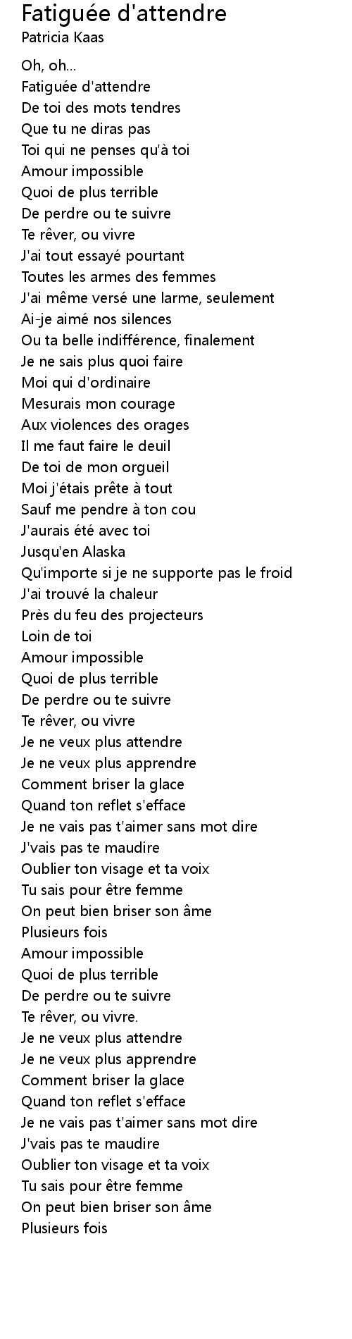 | Song | Fatiguée d'attendre |