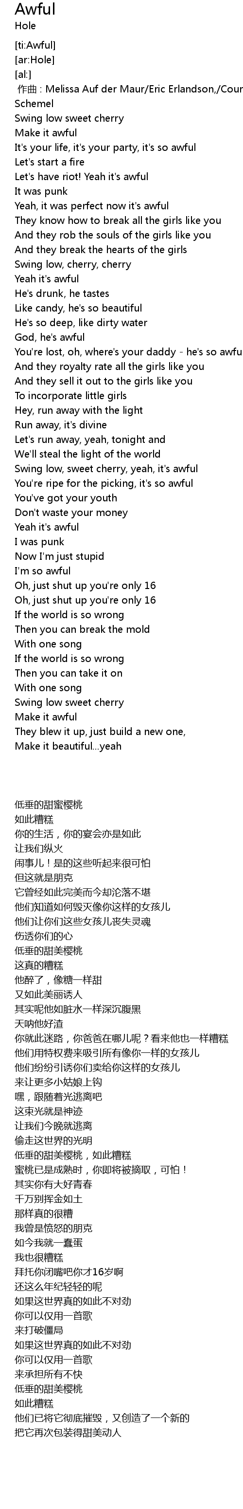 | [00:00.00] | 作曲 : Melissa Auf der Maur/Eric Erlandson,/Courtney Love/Patty Schemel |