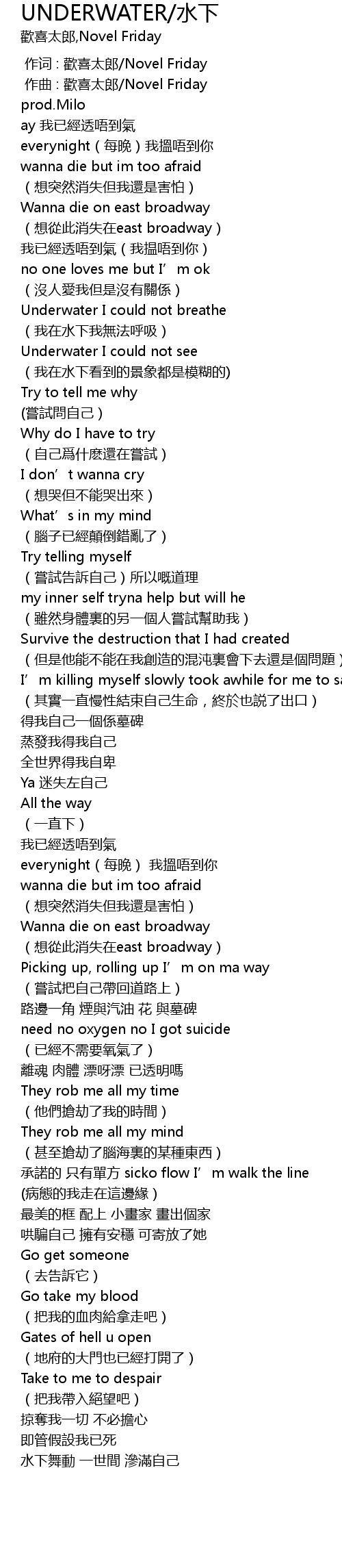 | [00:41.433] | wǒ zài shuǐ xià wǒ wú fǎ hū xī |