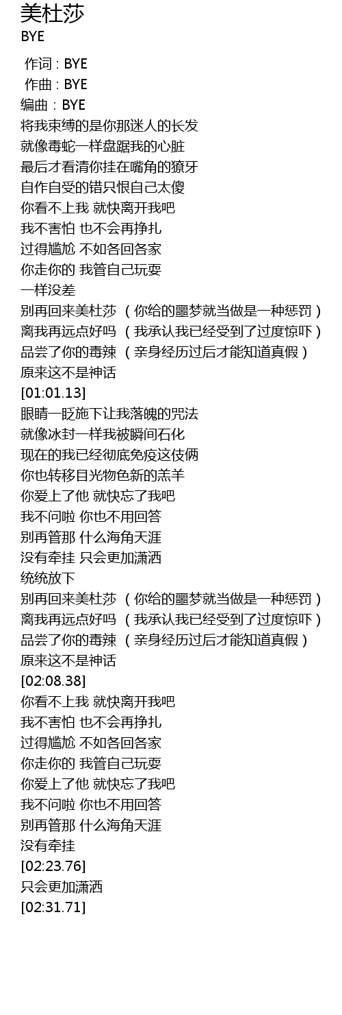 | [01:54.04] | 别再回来美杜莎 (你给的噩梦就当做是一种惩罚) |