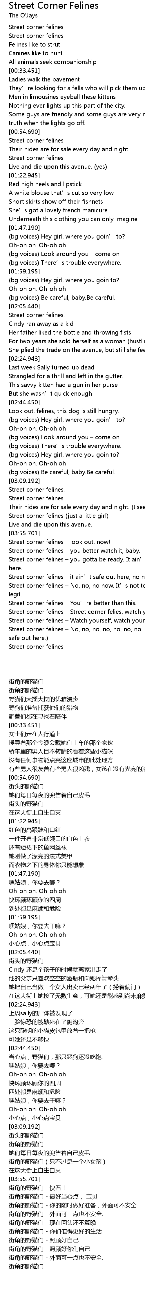 | [04:28.438] | Street corner felines Street corner felies, watch yourself. |