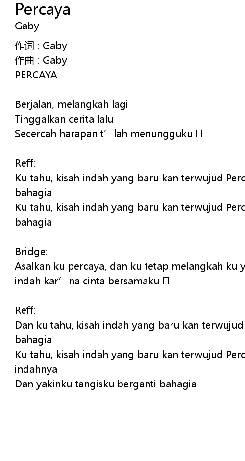 | Dan ku tahu, kisah indah yang baru kan terwujud Percaya, tangisku kan berganti bahagia | |