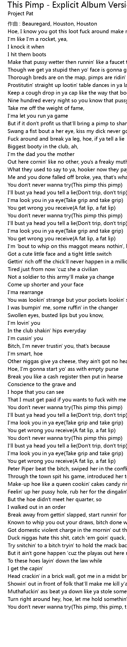 | Peter Piper beat the bitch, swiped her in the conflict | |