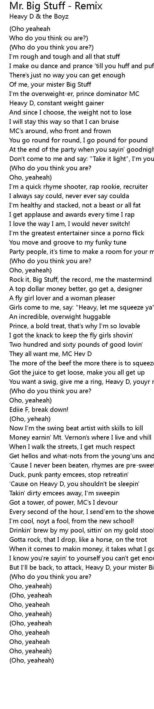 But I'll be back, to attack, Heavy D, your mister Big Stuff |