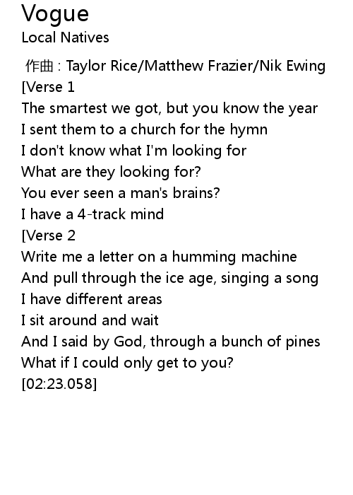 | [00:00.000] | zuo qu : Taylor Rice Matthew Frazier Nik Ewing |