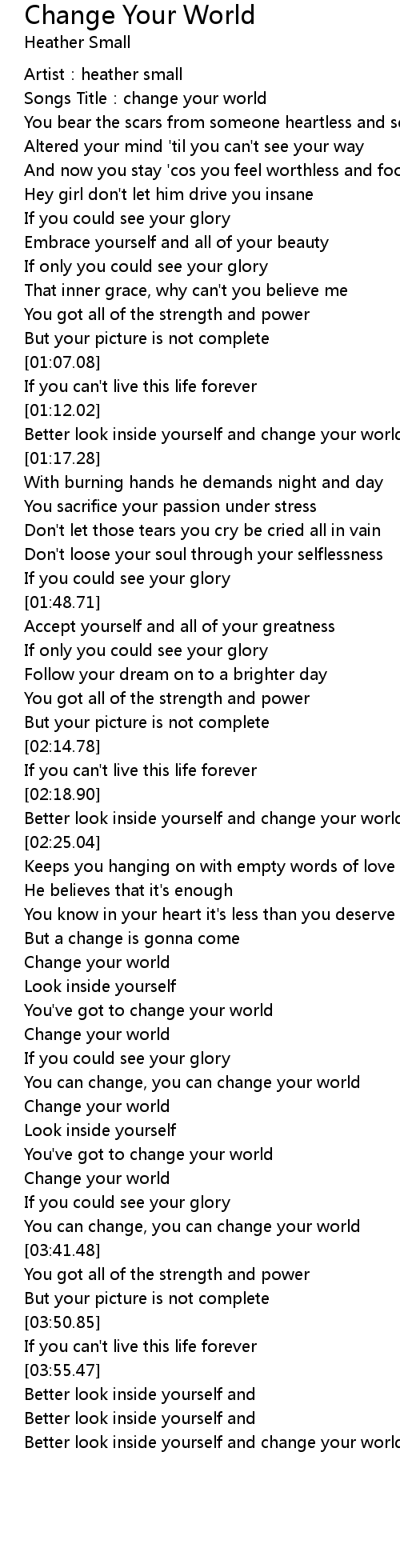 | [01:12.96] | Better look inside yourself and change your world |