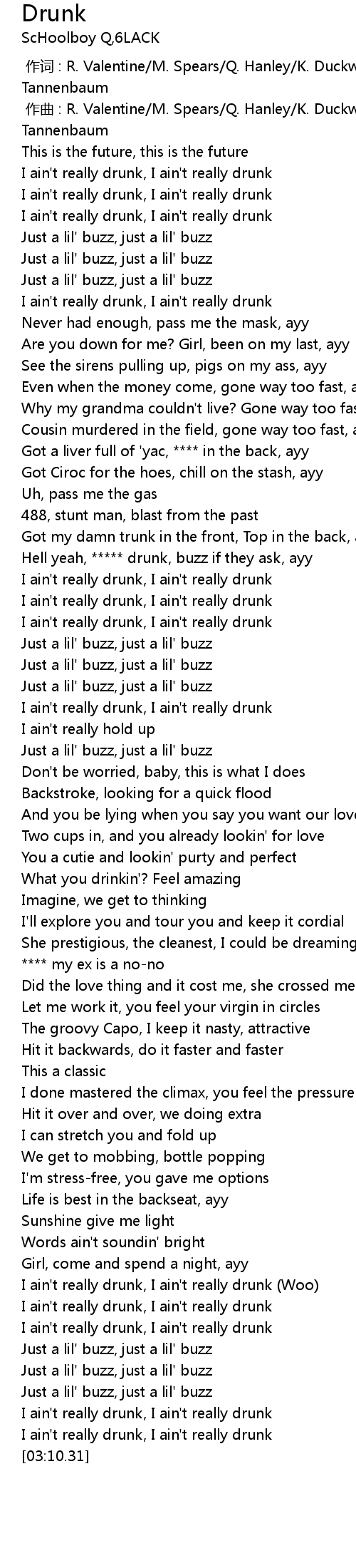 | [01:07.58] | Hell yeah, ***** drunk, buzz if they ask, ayy |
