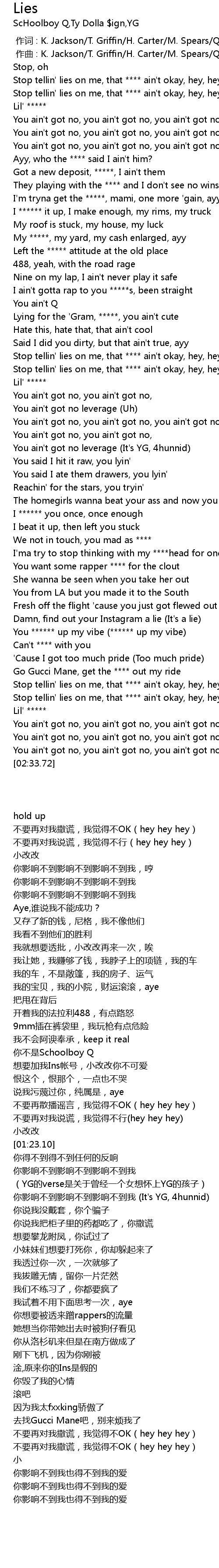 | [01:16.86] | Stop tellin' lies on me, that **** ain't okay, hey, hey, hey |