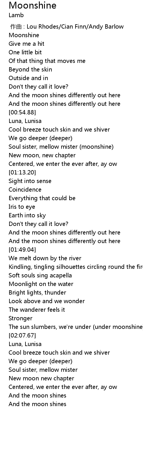 | [01:02.94] | Soul sister, mellow mister (moonshine) |