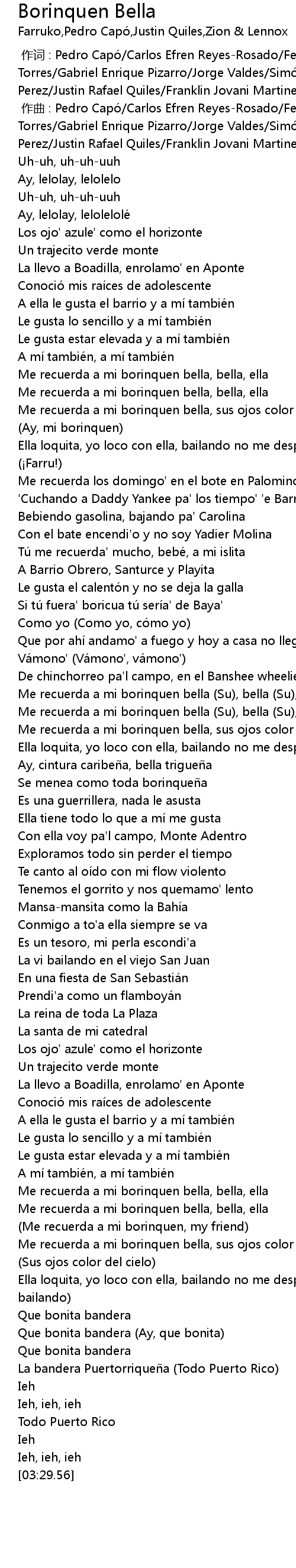 | [02:53.22] | Me recuerda a mi borinquen bella, bella, ella |