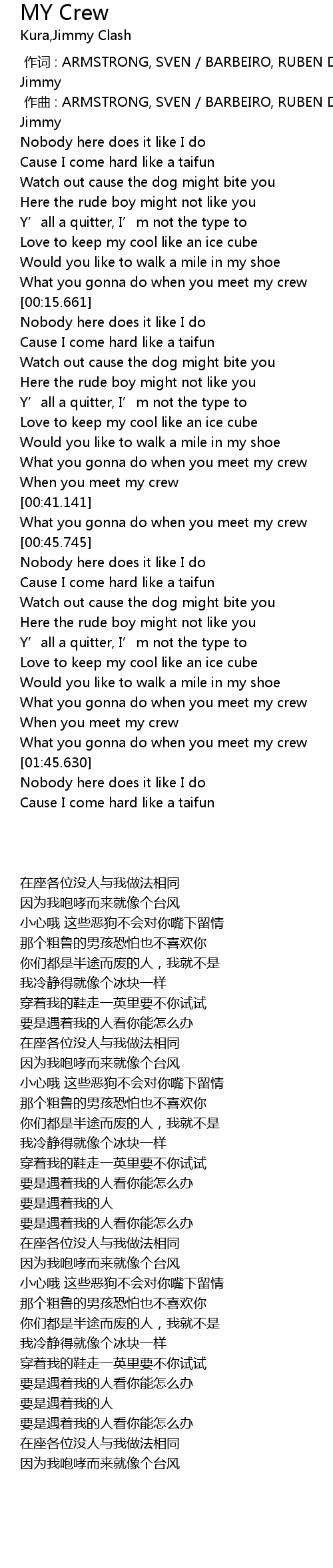 | [01:38.178] | What you gonna do when you meet my crew |