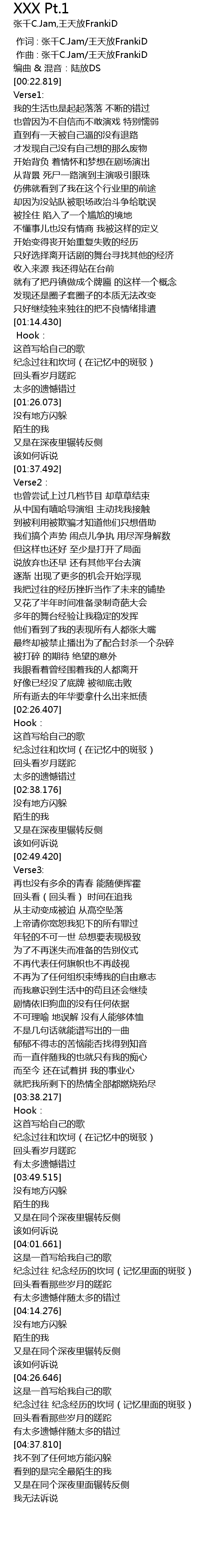 | [00:00.000] | zuò cí : zhāng qiān C. Jam wáng tiān fàng FrankiD |