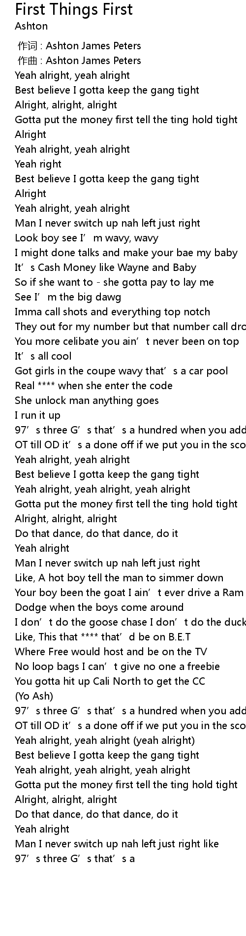 | [00:16.29] | Gotta put the money first tell the ting hold tight |