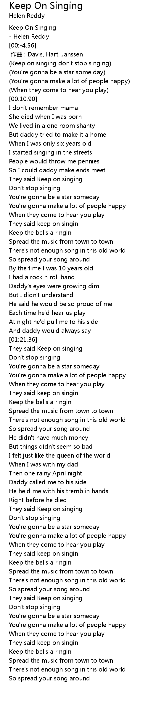 | [01:22.50] | They said Keep on singing |