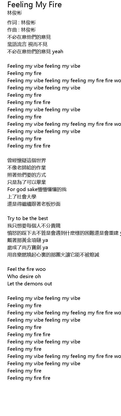 | Feeling my vibe feeling my feeling my fire fire woo | |