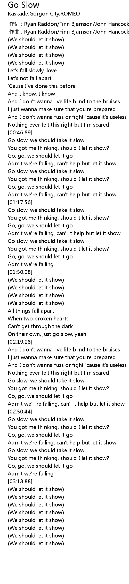 | [00:59.04] | Admit we're falling, can't help but let it show |