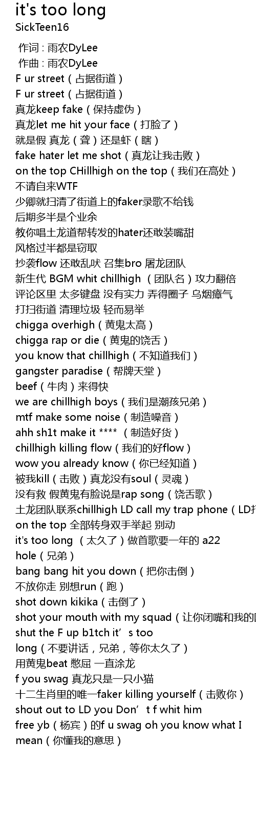 | [01:37.686] | shut the F up b1tch it’s too long(不要讲话,兄弟,等你太久了) |