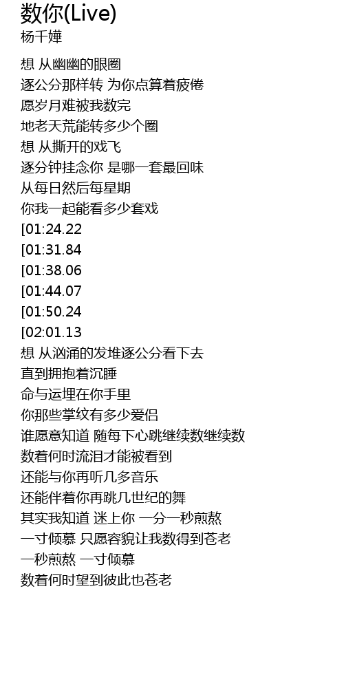 | [03:01.96][01:50.24] | 其实我知道 凭每下心跳续数继续数 |