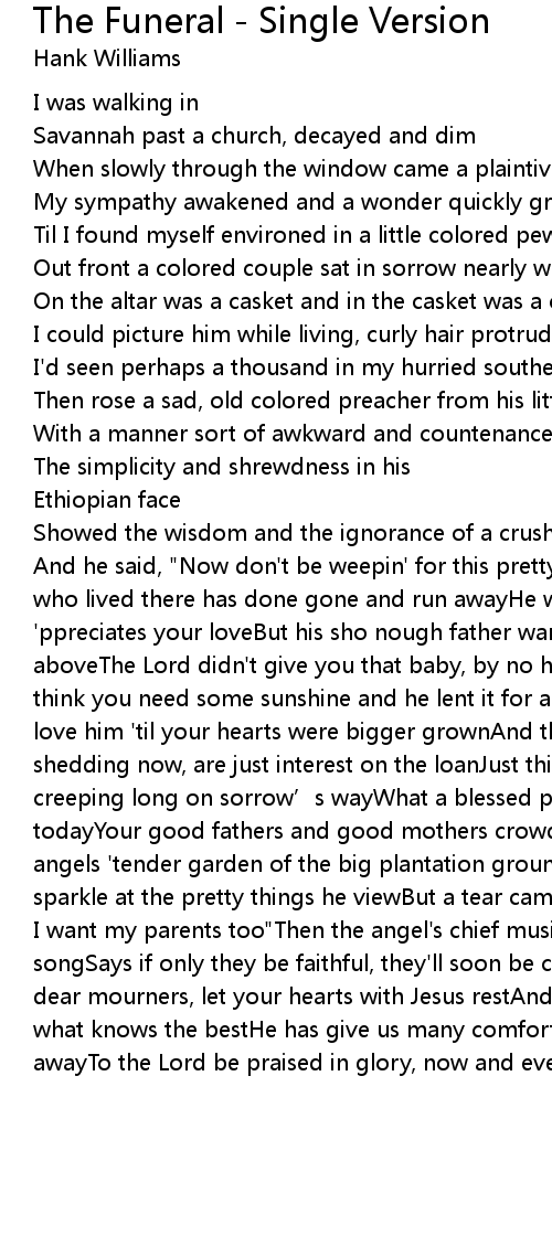 | I want my parents too"Then the angel's chief musicians teach that little boy a songSays if only they be faithful, they'll soon be comin' 'longAnd so my poor dear mourners, let your hearts with Jesus restAnd don't go to criticizn' the one what knows the bestHe has give us many comforts He's got the right to take awayTo the Lord be praised in glory, now and ever, let us pray |