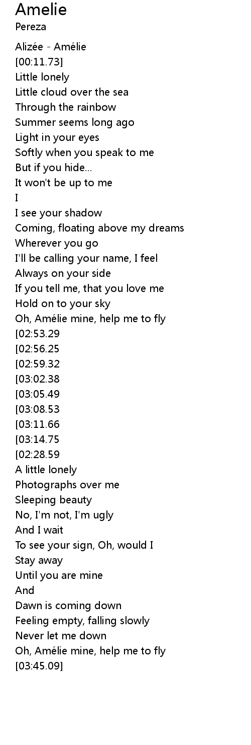 | [03:33.23][03:08.53][02:19.28][01:17.59] | Loving Amélie, love will be, will be |