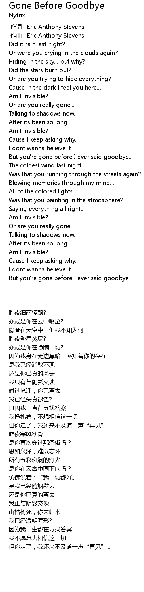 | [03:02:17] | But you' re gone before I ever said goodbye... |
