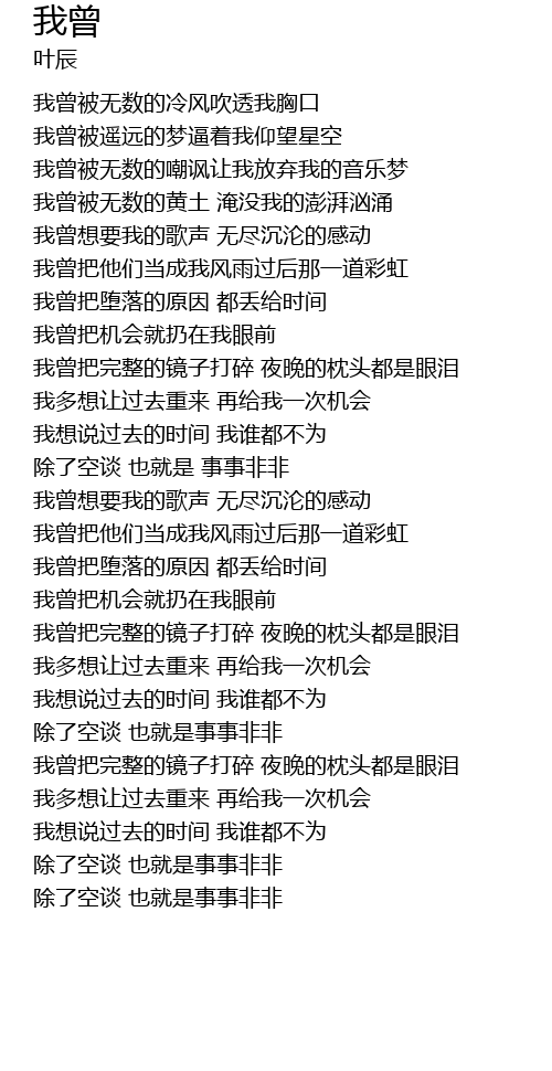 | [03:26.669] | 我曾把完整的镜子打碎 夜晚的枕头都是眼泪 |