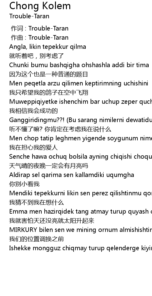 | [00:56.116] | Ishekke mongguz chiqmay turup qelenderge kiyim yarishish tin burun |