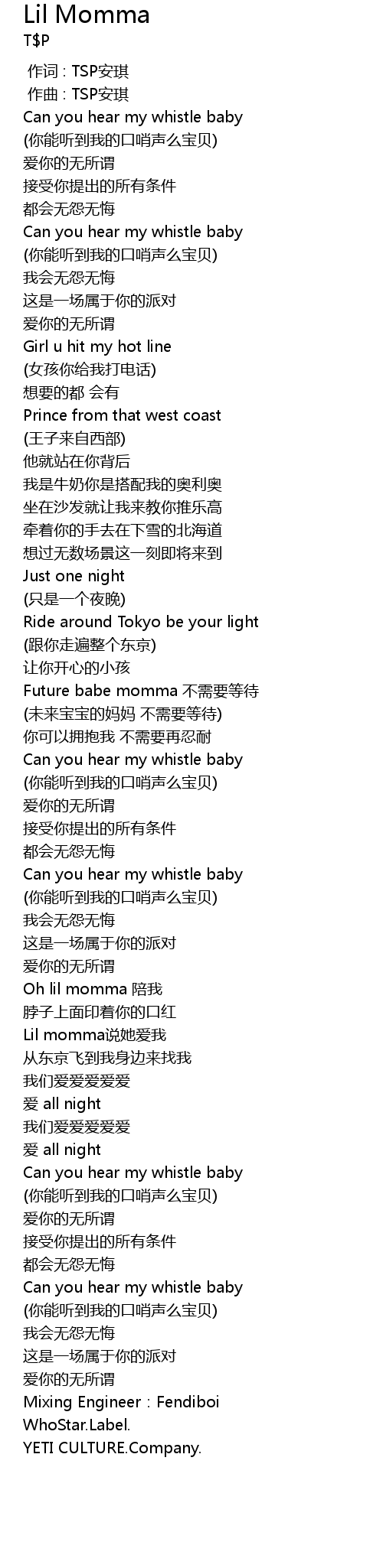 | [01:14.036] | (你能听到我的口哨声么宝贝) |