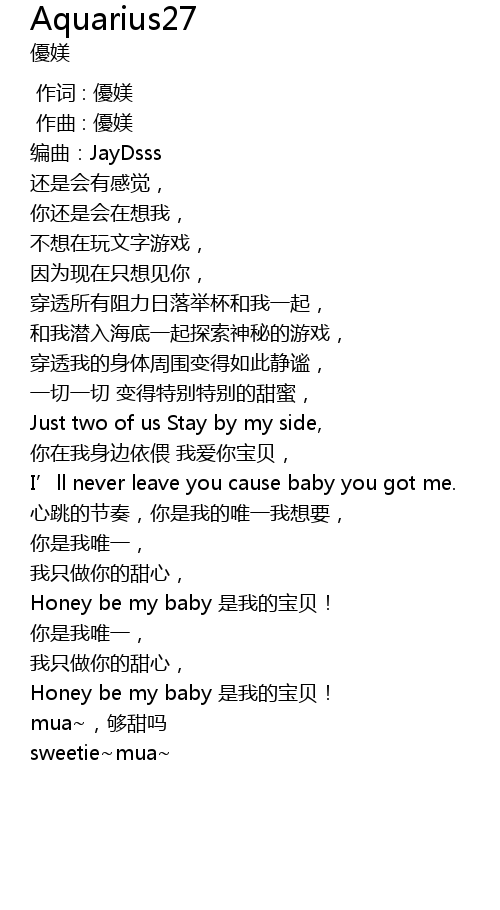 | [00:46.914] | 你在我身边依偎 我爱你宝贝, |