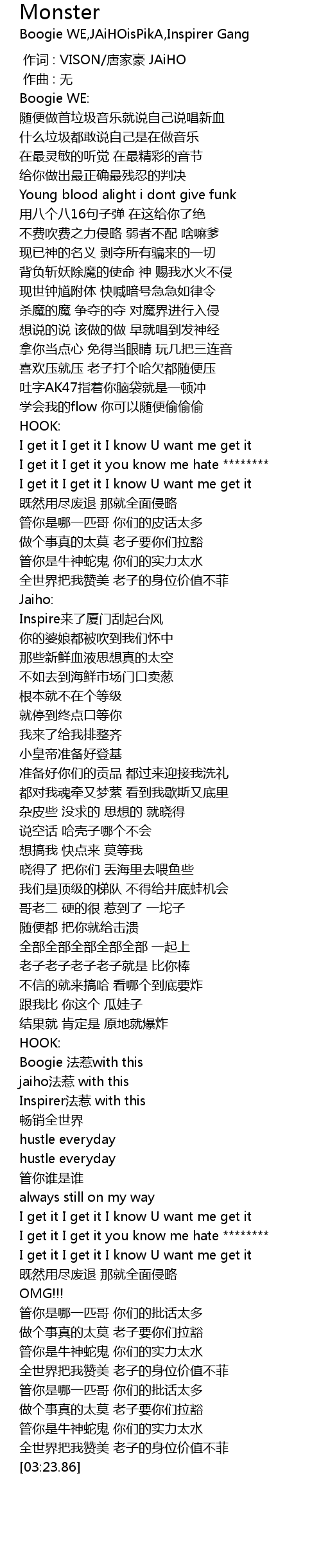 | [03:14.32] | 管你是牛神蛇鬼 你们的实力太水 |